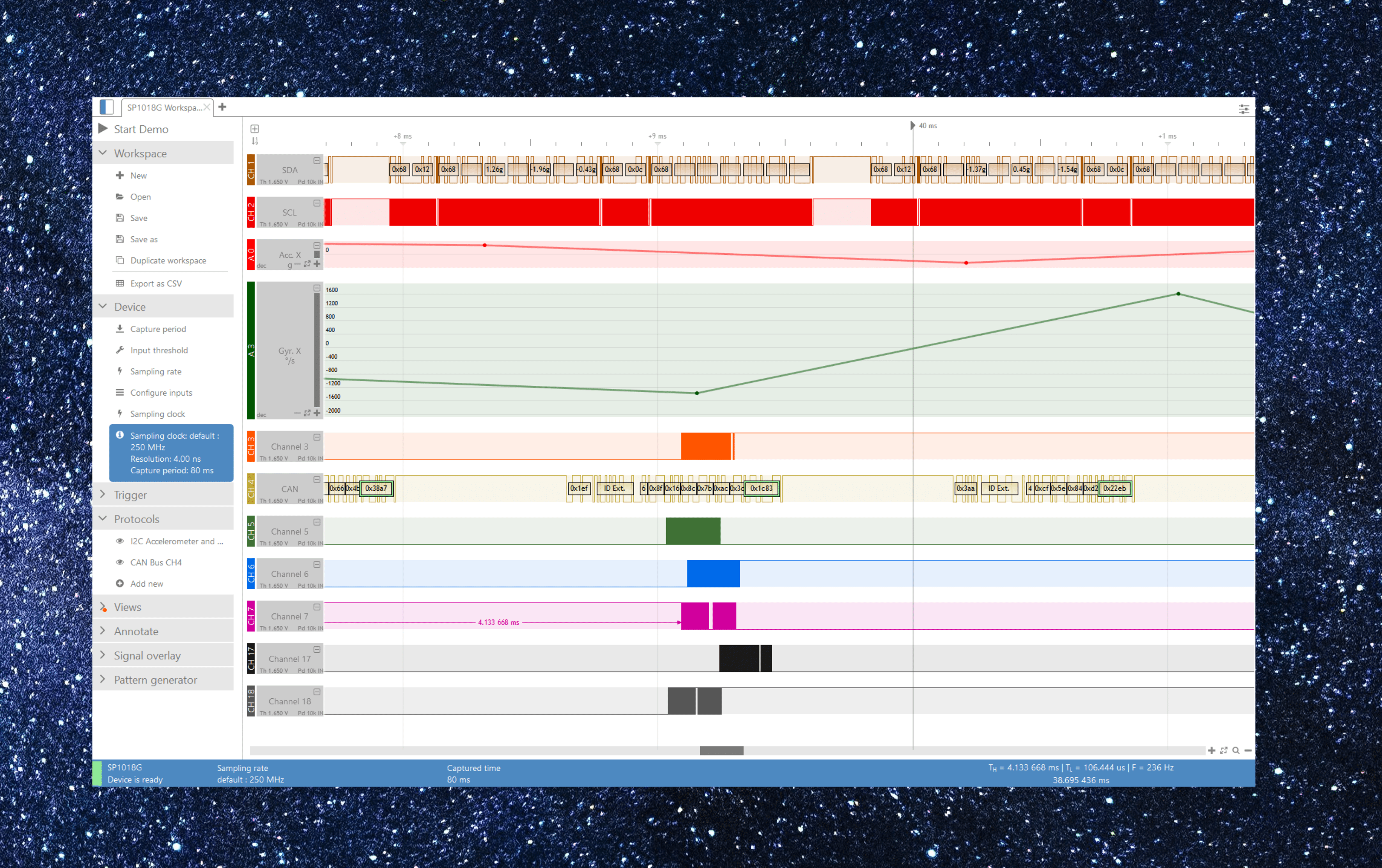 - Serial protocols analysis, like I2C, SPI, UART or 1-Wire (non exhaustive list)