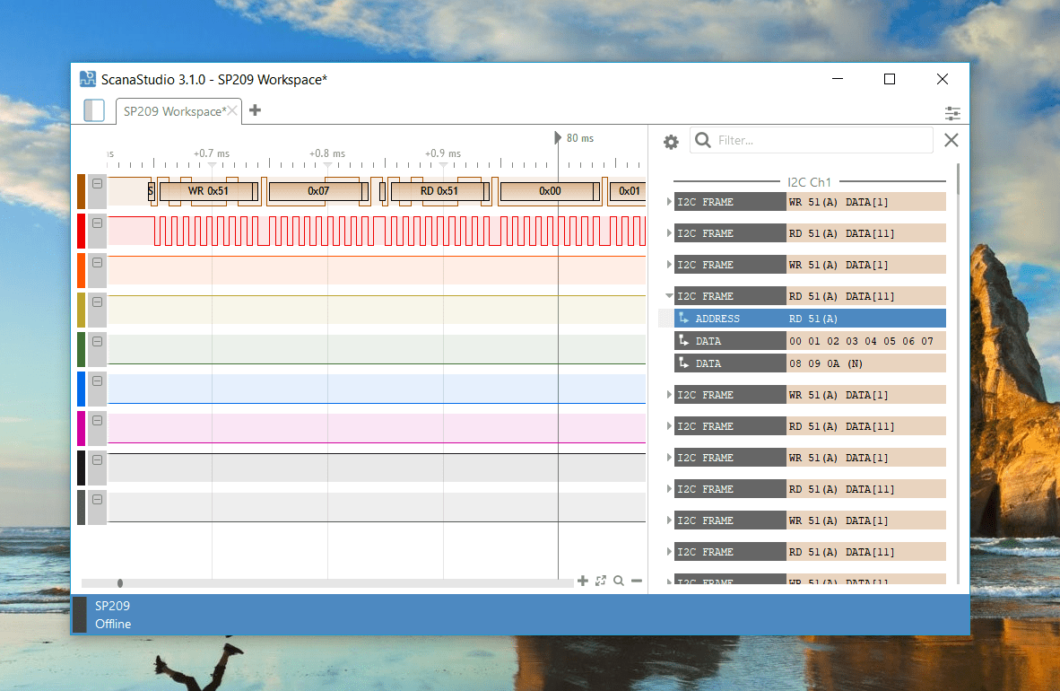 SP209 series logic analyzers rely on ScanaStudio software (runs on Windows, Mac and Linux) to capture, display, analyze and decode signals. Most industry standard protocols can be interpreted, among which: SPI, I2C, USART, 1-Wire, CAN, LIN, I2C, RS232, RS485, TWI and much more (click for full list of supported protocol decoders).