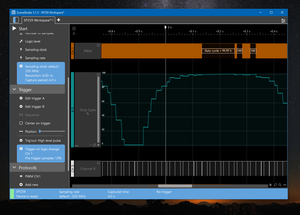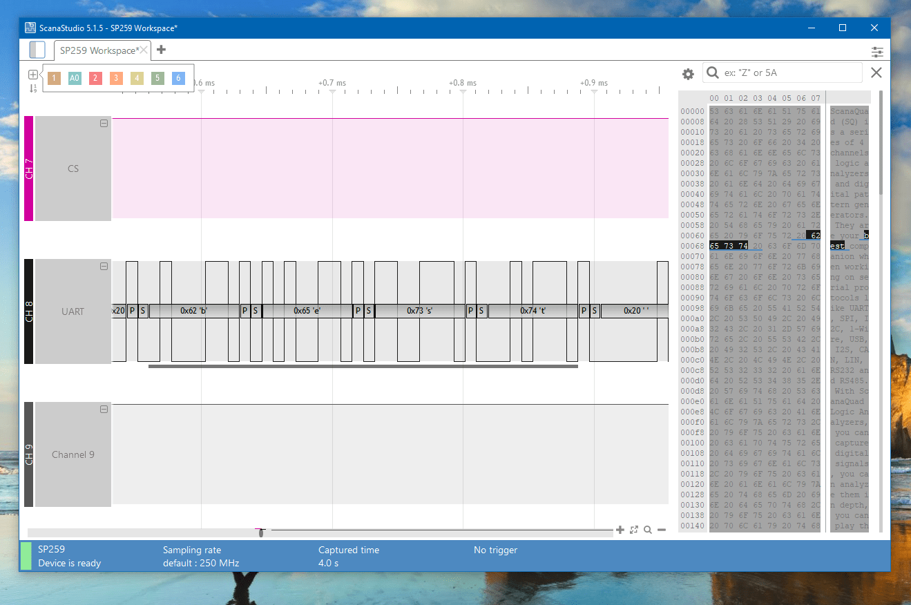 Designed for performance, SP259 series logic analyzers offer the possibility to capture and analyze 9 channels of logic signals and industrial buses at a rate of 250MHz. This is perfectly adapted for demanding applications, where it is needed to capture logic signals with maximum resolution of 4ns on all 9 channels.