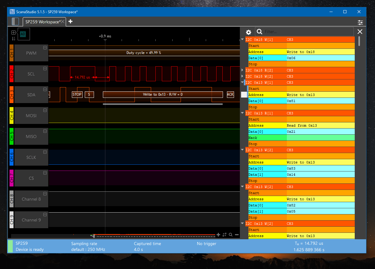 SP259 series logic analyzers rely on ScanaStudio software (runs Windows, Mac and Linux) to capture, display, analyze and decode signals. Most industry-standard protocols can be interpreted, among which: SPI, I2C, USART, 1-Wire, CAN, LIN, I2C, RS232, RS485, TWI and many more (click for the latest list of supported protocol decoders).